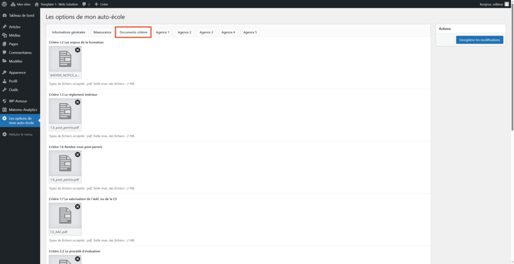 Dans les options de l’auto-école, accédez à l’onglet « Documents critères ».