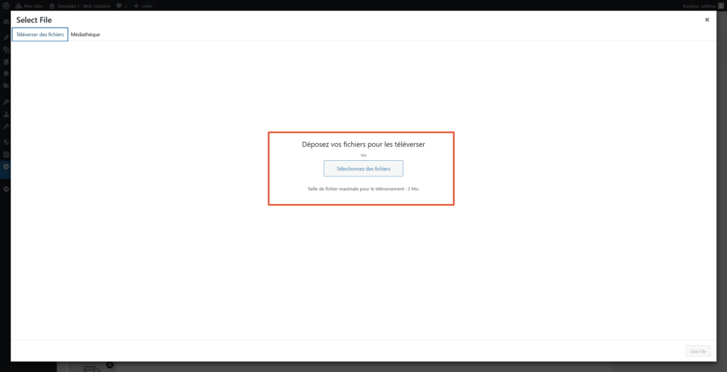 Cliquez sur le bouton « Select File ». La médiathèque s’ouvrira automatiquement.