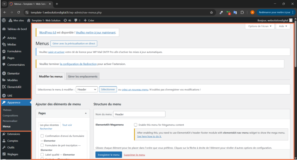Cet onglet contient plusieurs sous-menus pour personnaliser l’apparence de votre site. Celui qui nous intéresse ici est Menus :