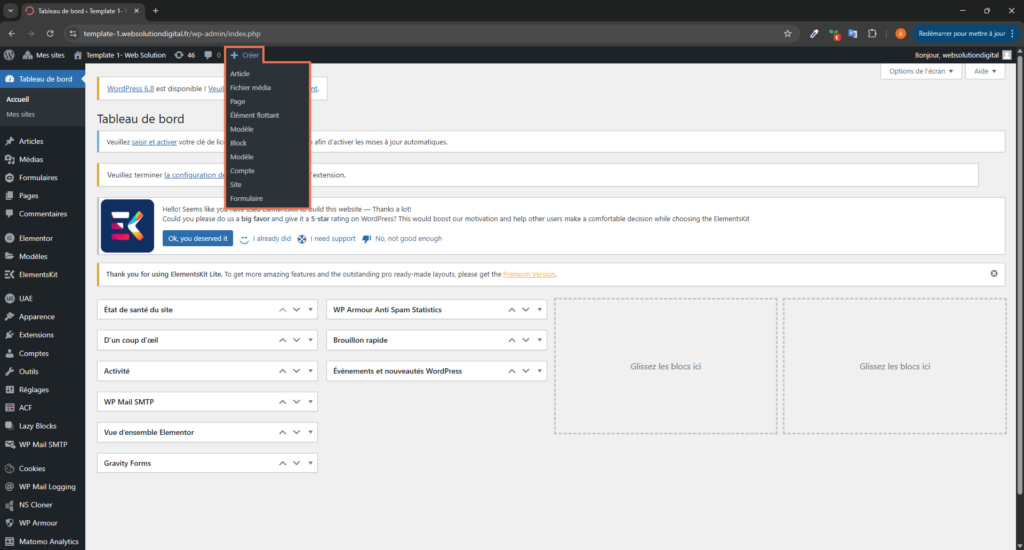 L’icône “+” : ce bouton permet de créer de nouveaux contenus : pages, articles, modèles, et autres éléments selon vos besoins.