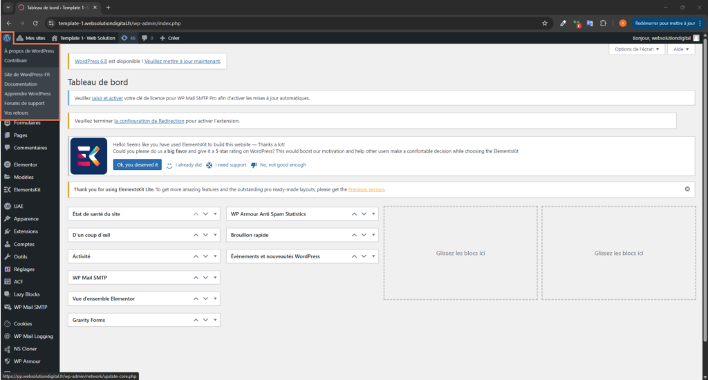 L’icône WordPress : en haut à gauche, cette icône vous donne accès à des informations générales sur WordPress.