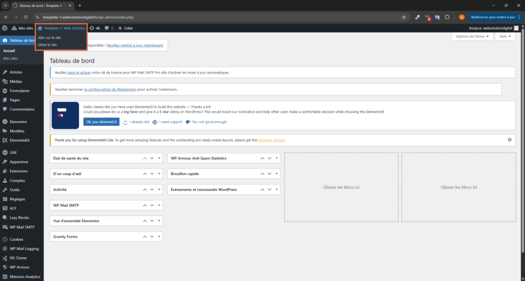 L’onglet avec l’icône de maison et le nom de votre site web : en cliquant dessus, vous accédez au front-office, c’est-à-dire la partie publique de votre site visible par vos visiteurs et vos clients.