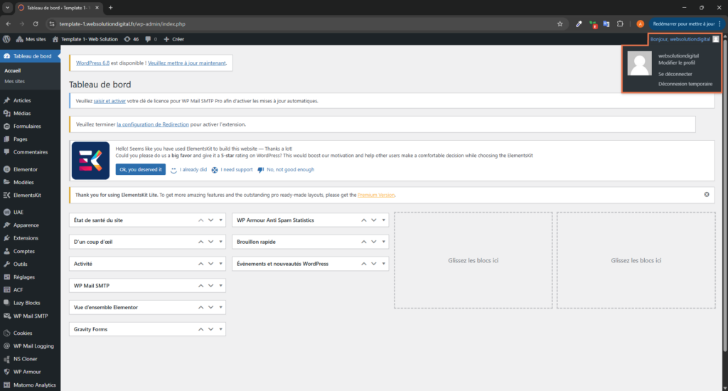 Votre compte utilisateur : situé tout à droite, cet espace vous permet d’accéder à votre profil utilisateur, de vous déconnecter ou de modifier vos préférences personnelles.